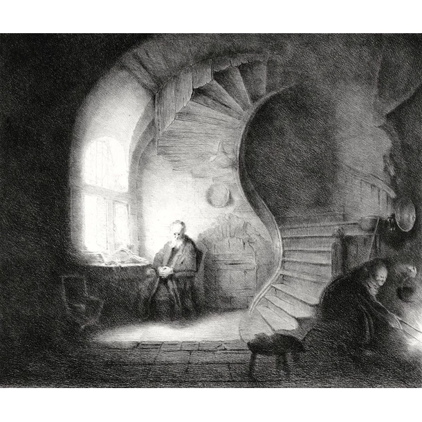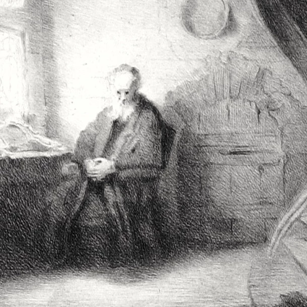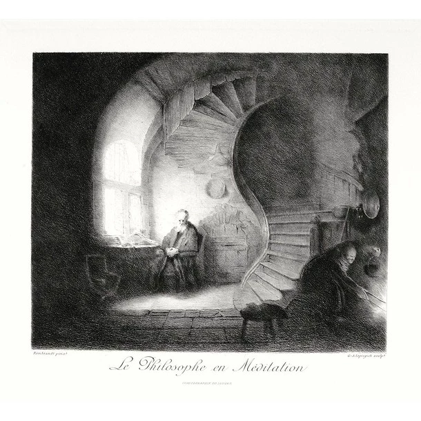 Cette estampe est une reproduction du tableau « Le Philosophe en méditation », peint par le maître néerlandais Rembrandt en 1632, exposé au musée du Louvre.