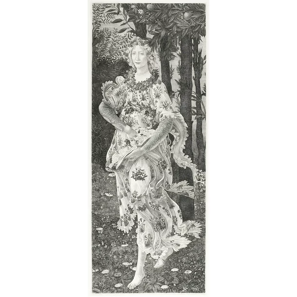 Cette gravure reprend un détail de l’oeuvre de Sandro Botticelli, Le Printemps.