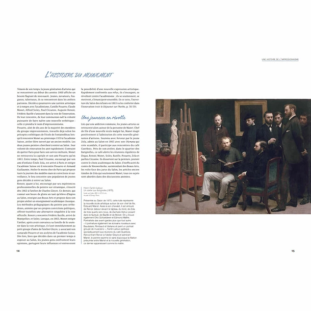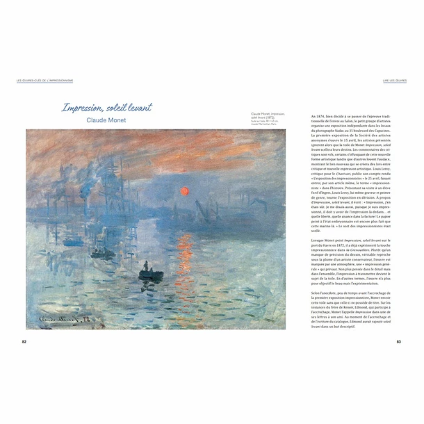 Le Déjeuner sur l’herbe de Manet, Impression, soleil levant de Monet, Les raboteurs de parquet de Caillebotte, Les Bal du Moulin de la Galette de Renoir, Olympia de Cézanne… : 30 chefs-d’œuvre de l’impressionnisme présentés, analysés en détail et expliqués, afin de faire comprendre les fondements, les évolutions et les développements du mouvement impressionniste, l’un des courants les plus fameux de l’art occidental.