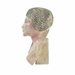 Attribuée à la période amarnienne, cette tête féminine en calcaire laisse planer le doute quant à sa datation. Si sa coiffure est typique ce cette période, son visage ne porte cependant pas les principales caractéristiques du style du règne d’Aménophis IV Akhenaton. Sous l’impulsion de ce pharaon, le canon stylistique se modifie pour adopter un style reconnaissable entre tous, avec notamment une exagération des traits naturels.