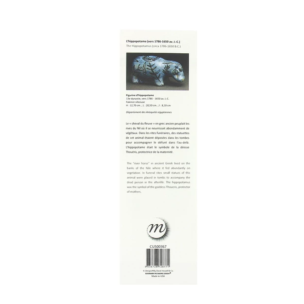 Le « cheval du fleuve » en grec ancien peuplait les rives du Nil où il se nourrissait abondamment de végétaux. Dans les rites funéraires, des statuettes de cet animal étaient déposées dans les tombes pour accompagner les défunts dans l’au-delà. L’hippopotame était le symbole de la déesse Thouéris, protectrice de la maternité.