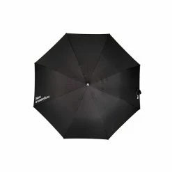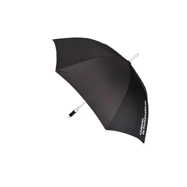 Un élégant parapluie noir avec le logo du château de Fontainebleau.