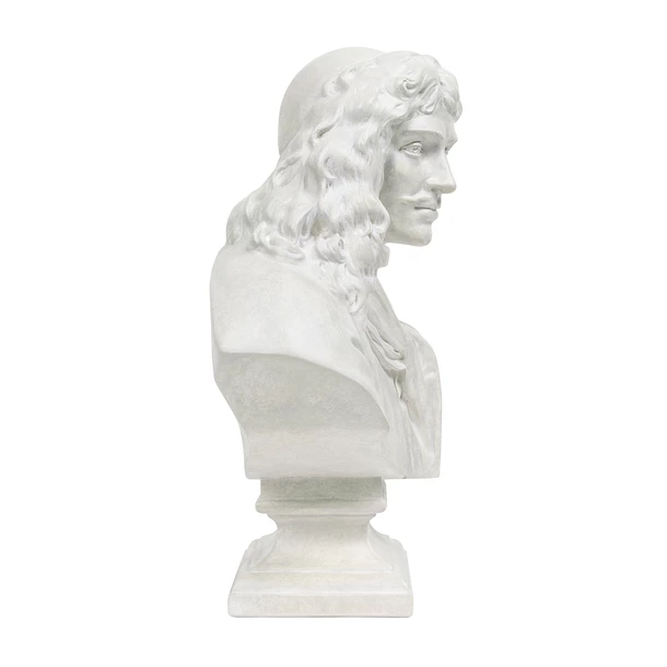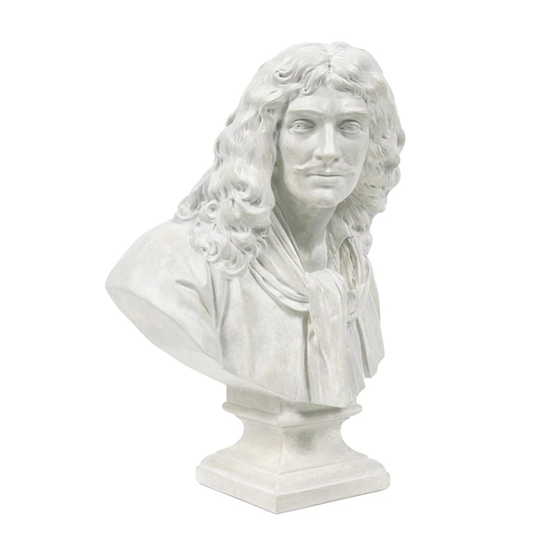 Houdon sculpta le buste de Molière pour la Comédie Française en s’inspirant notamment d’une peinture de Nicolas Mignard réalisée du vivant du dramaturge né au siècle précédent. La tête tournée vers le côté, le regard alerte, une fine moustache surmonte ses lèvres pleines. Le cou encadré par le col ouvert de sa chemise et une cravate entortillée sur le devant, donne à la figure de Molière d’une élégance empreinte de désinvolture, révélant ainsi la touche de Houdon.