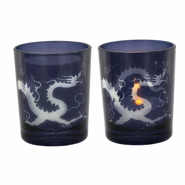 Ce photophore en verre est inspiré d’un détail d’un vase meiping à décor de dragon (Chine, XIVe siècle, dynastie yuan (1279-1368) – Porcelaine. H. 33,6; l. 20,1 cm. Paris, musée national des arts asiatiques Guimet).