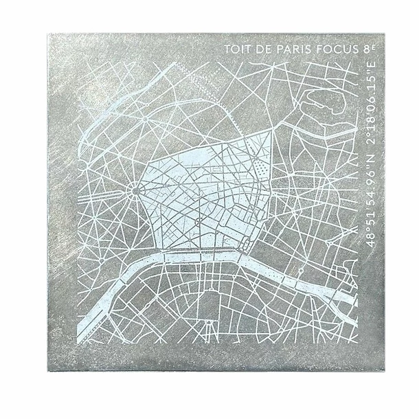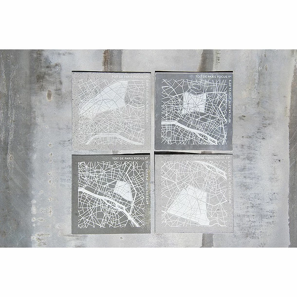 F O C U S est un morceau de toit de paris de plus d’un demi siècle. Il a été sérigraphié avec un plan focus sur son arrondissement.