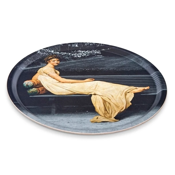 La peinture originale, datant de 1800, représente Juliette Récamier. Sur ce plateau en laminé de bouleau, Madame Récamier n’est plus assise sur un sofa mais sur un typique banc de jardin parisien !