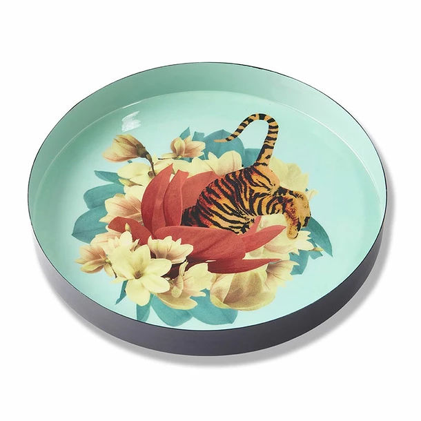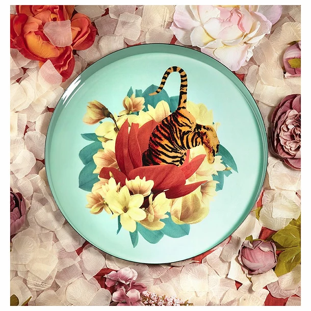 Plateau rond décoratif verni avec un tigre plongeant dans un bouquet de fleurs, fabriqué à la main par Ganzaï.