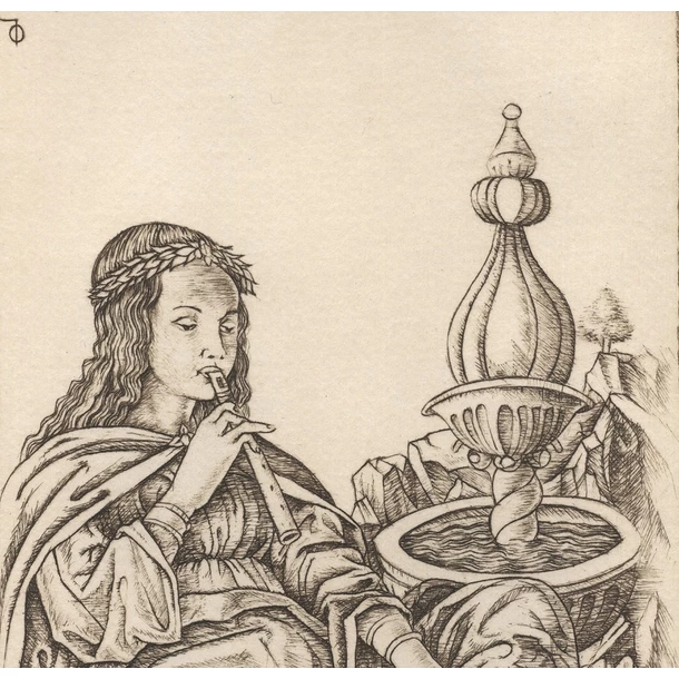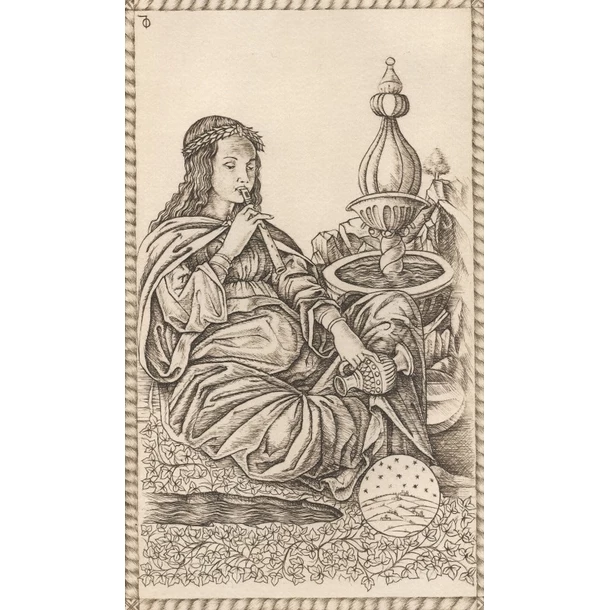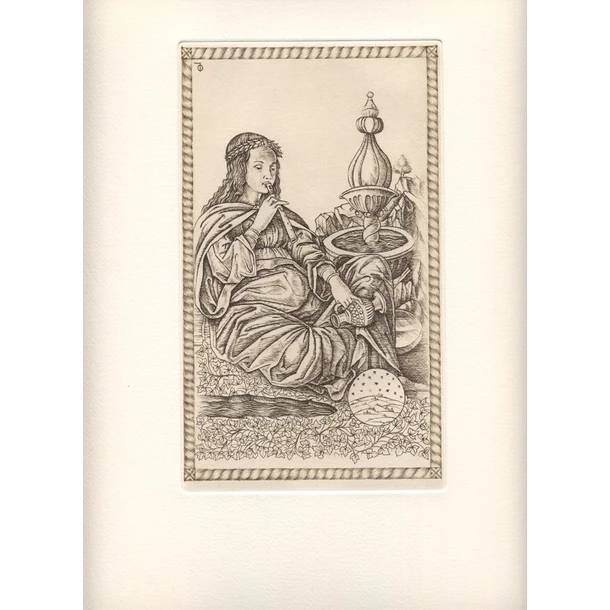 Estampe Poesia, Carte 27 dans la décade des Arts Libéraux par Cécile Reims née en 1927, d’après les cartes de tarot de Mantegna (1431-1506).