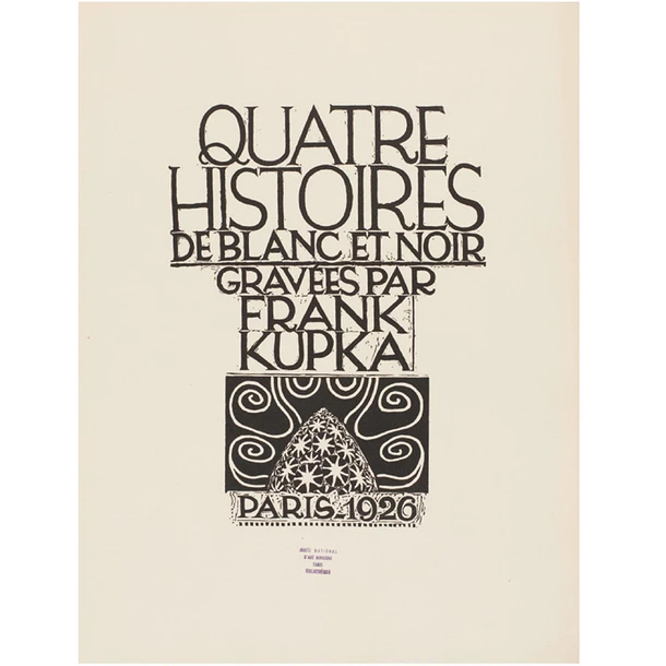 Entièrement conçu par Kupka et publié à 300 exemplaires à compte d’auteur en 1926, Quatre histoires de blanc et noir offre à l’artiste la possibilité de donner forme à son idéal livresque. Il y dresse un bilan éloquent de sa création de la quinzaine d’années écoulées depuis son rejet de la mimésis et en récapitule certains des aspects les plus significatifs en les mettant en relation les uns avec les autres de manière logique.