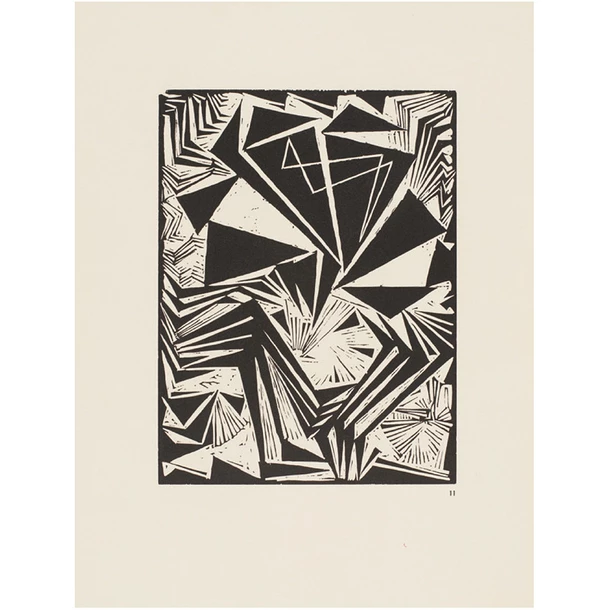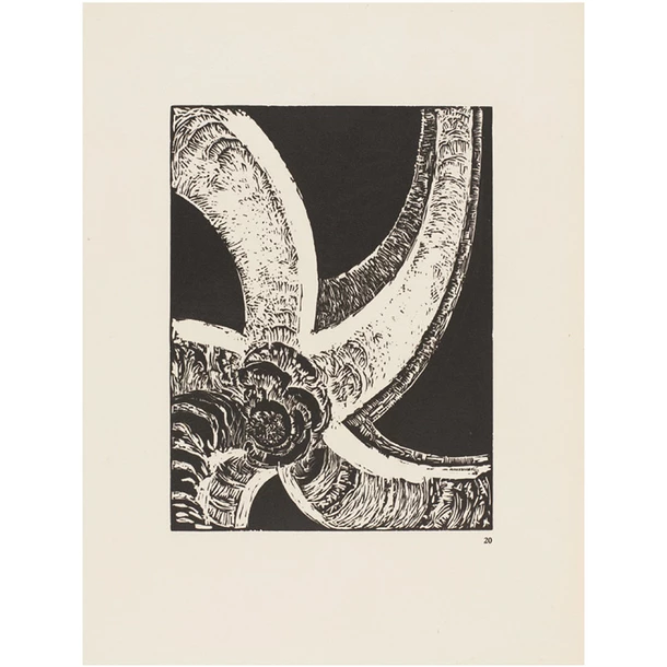 Recourant à nouveau au bois gravé pour transposer graphiquement son univers pictural, Kupka en livre une lecture magistralement ordonnée en quatre chapitres : organique-décoratif ; triangulaires ; ondulant-cosmique ; verticales et diagonale.