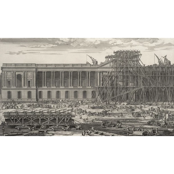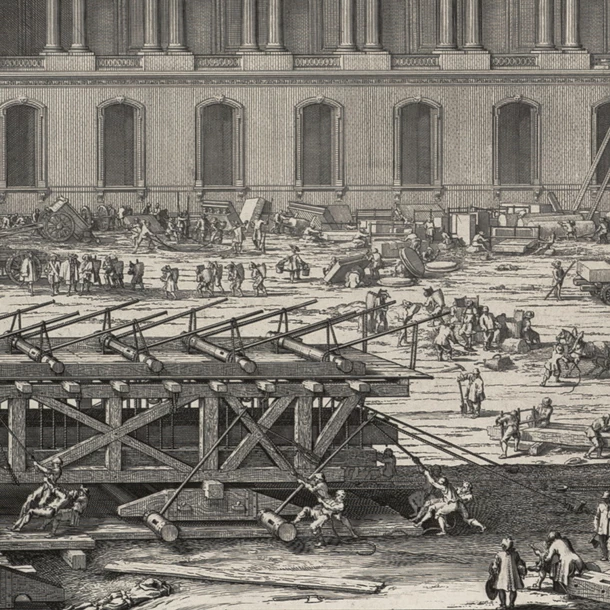 La colonnade du Louvre constitue la façade orientale du palais du Louvre. Elle passe pour un des chefs-d’œuvre du classicisme français. Le projet final a été entrepris en 1667. Malgré son nom de « colonnade de Perrault », il pose encore un problème d’attribution, sa conception étant le fruit de multiples influences, dont celles de louis Le Vau architecte du roi, Charles Le Brun, premier peintre du roi, et Claude Perrault architecte. Il faut donc la voir comme un mélange d’inspirations diverses. L’opération la plus délicate a été la pose de deux pierres formant la cimaise du fronton ayant chacune 17 mètres de long et 2,50 mètres de large. En 1672, la mise en place de ces pierres est réalisée. Depuis leur taille dans une carrière de Meudon, l’opération a duré 3 ans et a nécessité la construction d’une machine inventée par le charpentier Ponce Cliquin. Pour immortaliser ce tour de force l’artiste, Sébastien Le Clerc, a lui-même fait preuve d’une virtuosité tant dans la composition que dans la maîtrise technique.