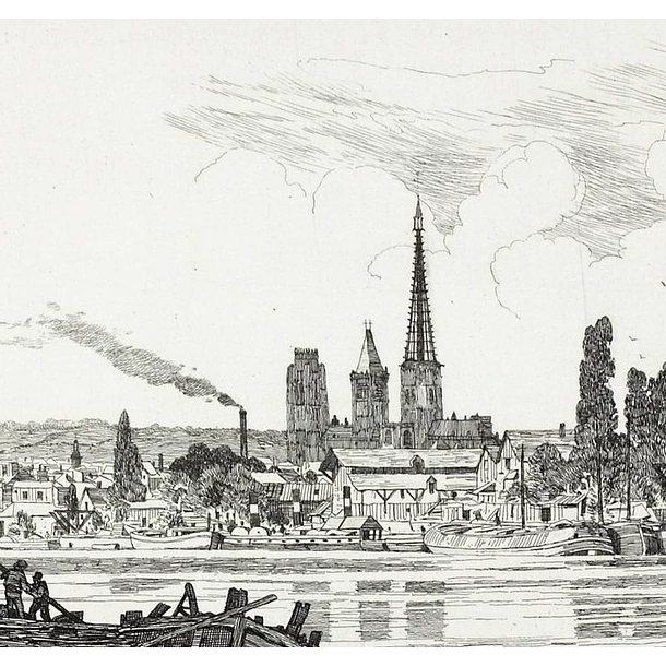 Son œuvre gravé se divise en deux parties. Ses vues des monuments et rues de Rouen constituent un témoignage lyrique de la vieille ville. Ses paysages, notamment ceux de Saint-Valéry-en-Caux où il passait ses étés, s’intéressent aux activités quotidiennes et pittoresques de ce port.
