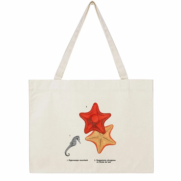 Ce sac cabas en toile est illustré d’un Hippocampe moucheté et Hyppasteria phrygiana ou Étoile de mer, illustration issue de la collection « Invicta ».