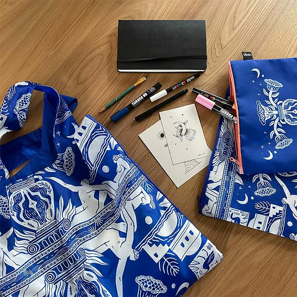 Que fait le bleu pour vous ? Le ciel et la mer. La sérénité du bleu. La pureté du blanc. L’œuvre d’art bleue et blanche sur ce sac recyclé nous entraîne dans un pays idyllique où les gens et la nature vivent en harmonie les uns avec les autres.