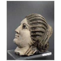 Bijou inspiré d’un masque funéraire daté de l’époque romaine. Ce type de boucles d’oreilles nommées « crotalia » (d’après un texte de Pline l’ancien) étaient très répandues dans l’ensemble de l’Empire romain.