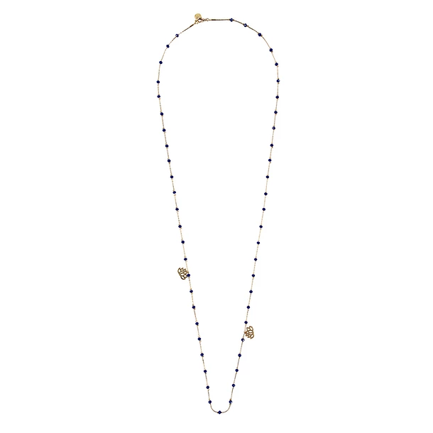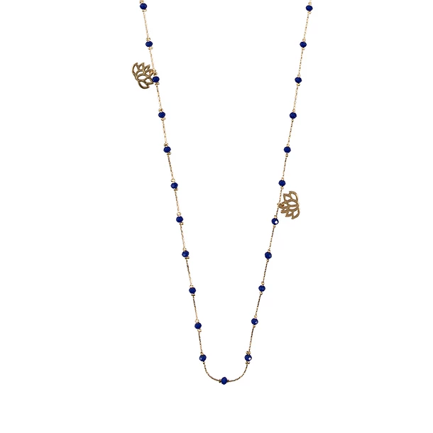 Ce sautoir avec des perles bleu roi et deux pendentifs en forme de nymphéas en étain doré est librement inspiré de la célèbre série des peintures de Claude Monet: Les Nymphéas, réalisée entre 1890 et 1926.