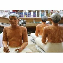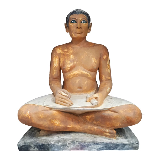 Ce scribe doit sa célébrité à son réalisme, accentué par la bonne conservation de sa polychromie et au mystère qui entoure sa découverte. Mais c’est surtout son regard qui fascine : incrustés de cristal de roche, ses yeux possèdent une étonnante puissance de vie. Le soin particulier apporté à cette sculpture laisse penser qu’il s’agit d’un très haut dignitaire de l’Ancien Empire.