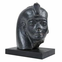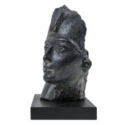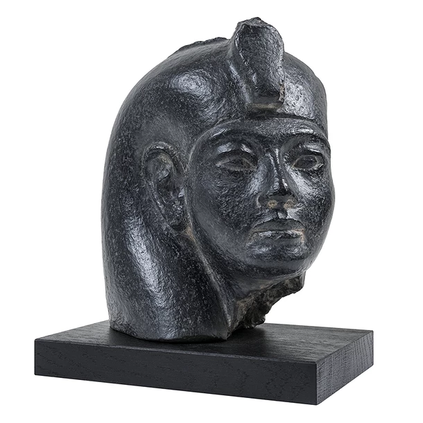 Cette très belle tête est coiffée d’une perruque enveloppante ornée d’un uræus frontal, laissant les oreilles dégagées.