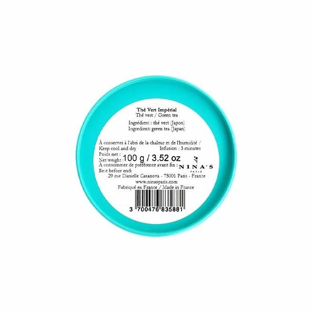 Dans cette boîte en métal bleu turquoise et dorée se cache le thé vert Impérial réalisé par Nina’s, maison de thé parisienne depuis 1672, spécialiste des parfums et arômes.