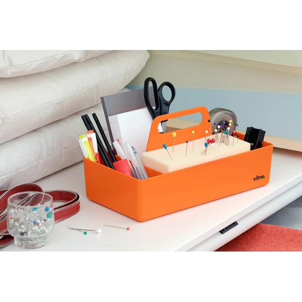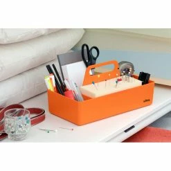 La Toolbox est conçue comme un ustensile d’organisation pratique pour le rangement d’accessoires et de petits objets. Grâce à sa taille pratique, elle peut être facilement rangée dans une armoire ou sur une étagère, et occupe peu de place sur une table. La Toolbox est disponible dans une palette de coloris.