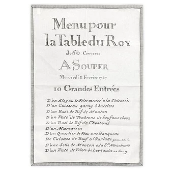 Ce torchon a été réalisé à partir du recueil « Voyages du Roi au château de Choisy, avec les logements de la cour et les menus de la table de Sa Majesté – Année 1747 », par Brain de Sainte-Marie.