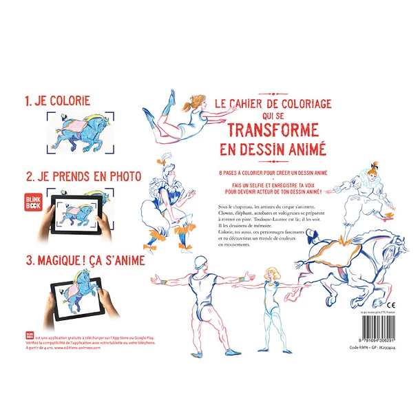 photo avec l’application BlinkBook téléchargeable Le coloriage peut ainsi s’animer sur une tablette ou un smartphone. Sous le chapiteau, les artistes du cirque s’animent. Clowns, éléphant, acrobates et voltigeuses se