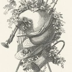Reproduction par Auguste Pèquègnot d’un trophée réalisé par Jean-Antoine Watteau avec une cornemuse entourée de décorations champêtres.
