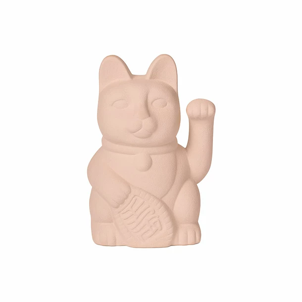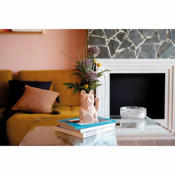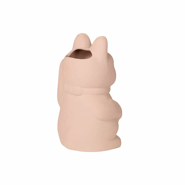 Ce vase rose en céramique reprend la forme du chat porte-bonheur japonais maneki-neko.