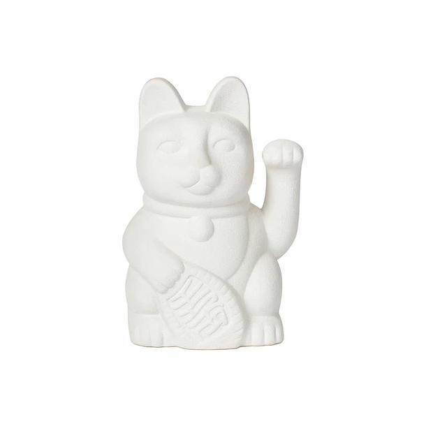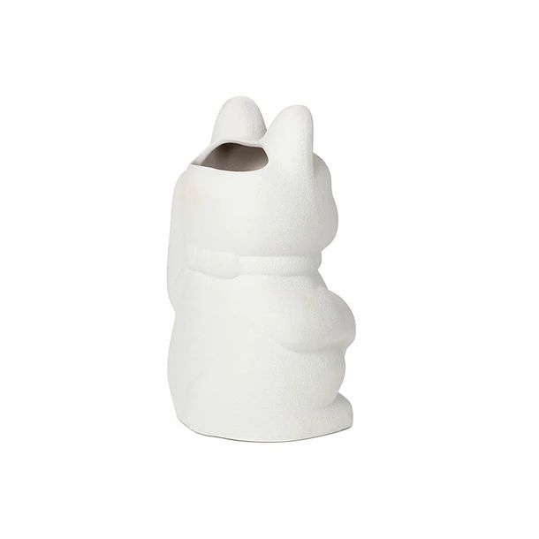 Ce vase blanc en céramique reprend la forme du chat porte-bonheur japonais maneki-neko.