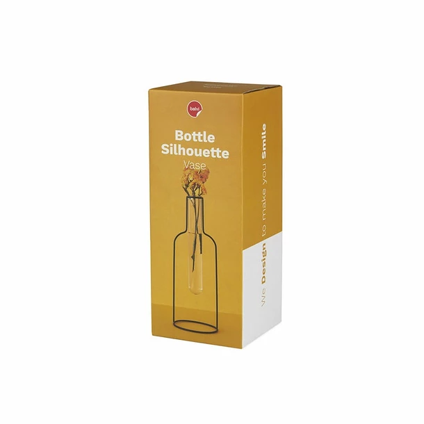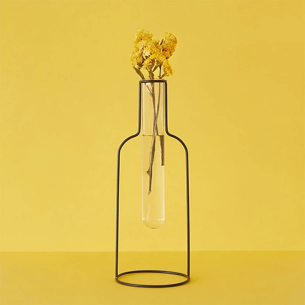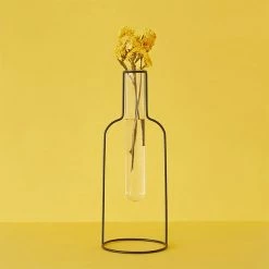 UN VASE EN FORME DE BOUTEILLE. La bouteille est en métal et constitue l’ossature. À l’intérieur de la bouteille, il y a un tube où sont mises les fleurs. La finition est jolie et surprenante.