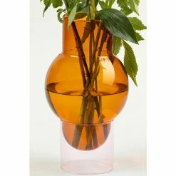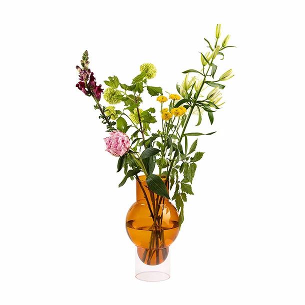 La collection Bubble Tube est une série de vases en verre fabriqués à la main et conçus pour les grands bouquets. Le vase en verre est ici disponible dans une bulle ambrée qui repose élégamment sur une base cylindrique en verre rose. Cette constellation crée un sentiment de légèreté et ajoute une expression féminine au vase.